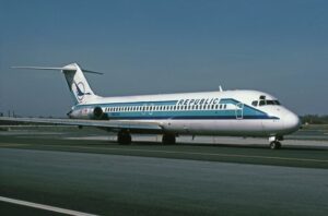 The McDonnell Douglas DC-9 Series 30 is a single-aisle airliner designed and manufactured by the Douglas Aircraft Company. Conceived initially as a smaller variant akin to the larger DC-8 in size and capacity, the original design featured two rear-mounted Pratt & Whitney JT8D turbofans under the T-tail. This design choice facilitated a cleaner wing design and incorporated built-in airstairs on the fuselage. In the late 1960s, Douglas introduced the Series 30 to compete with the Boeing 737 twinjet. The DC-9-31 design, featuring a stretched fuselage and wings, was successfully submitted and purchased by Eastern Airlines in early 1967 due to its improved performance.